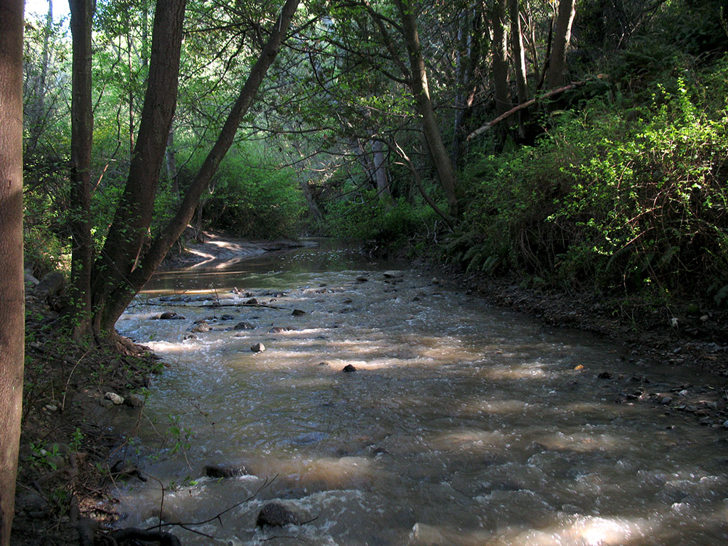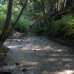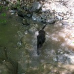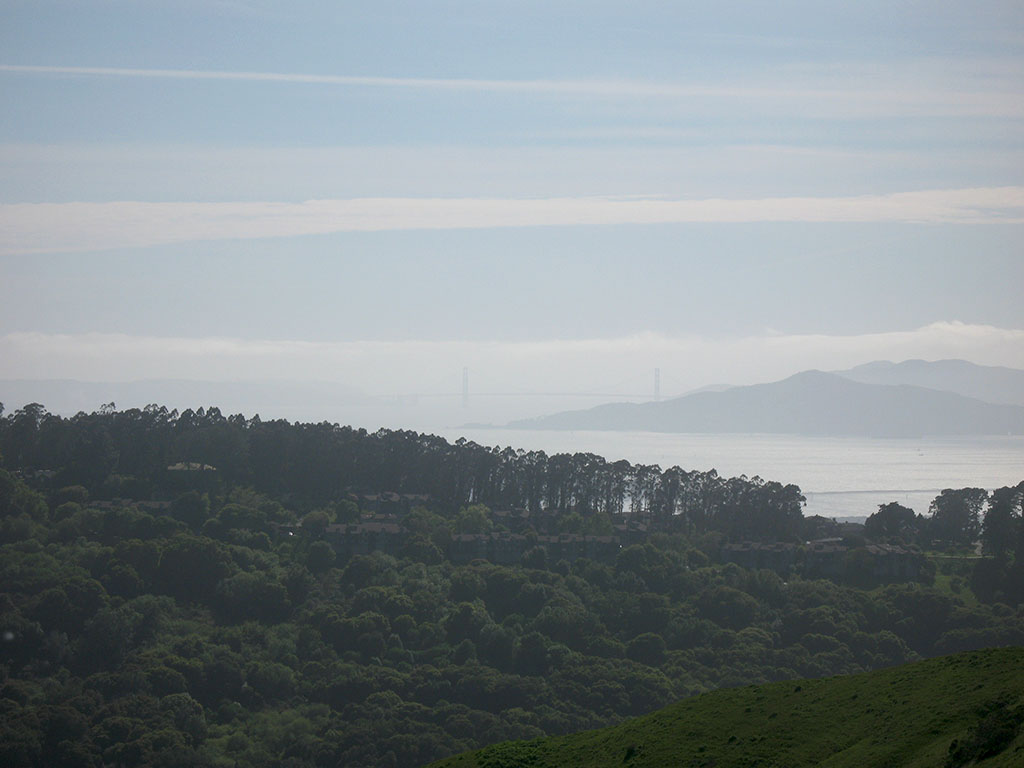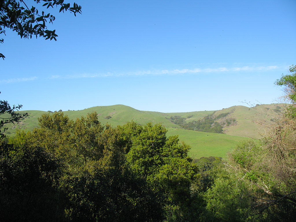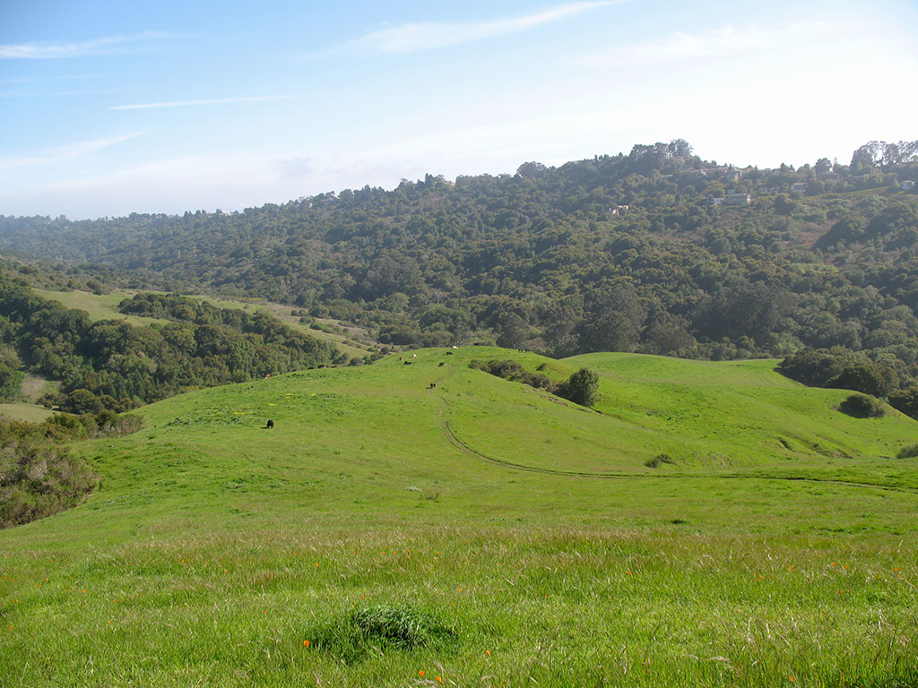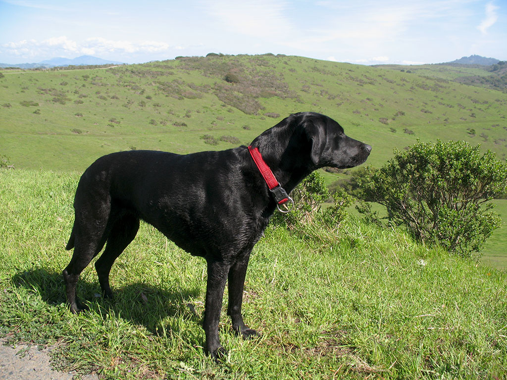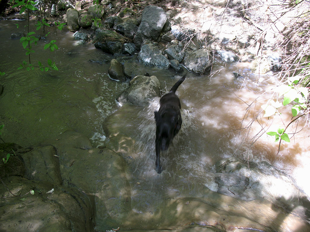 E. und ich – es sollte dazu gesagt werden, dass e. heute mal einen Gastbeitrag schreiben darf – waren heute auf Wanderschaft. Dreieinhalb Stunden sind wir durch den “Wildcat Canyon” geklettert, zunächst runter ins Tal, dann entlang des und schließlich durch das reißende Wasser des Havey Creeks Richtung Osten den nächsten Berghang wieder hoch. Oben am Kamm entlang Richtung Norden mit Aussicht über das “Hügelchen” von El Cerrito auf die Golden Gate Bridge Richtung Westen und dann wieder runter, runter, runter durch die Kuhherde – sehr neugierige Genossen – zurück auf den Wildcat Creek Trail, um vor dem letzten Anstieg noch ein Päuschen am Flüsschen zu machen. Derweilen hatte E. jede Menge Spaß, Spiel und Überraschung – vor Kühen fürchtet sich unser Hund ähnlich wie vor Mäusen, und Kuhfladen schmecken zwar offensichtlich (dem Hund) extrem gut, sind aber auch extrem schnell wieder draußen … Am Creek durchs Wasser zu toben und nach gut drei Stunden Wandern, Klettern, Schnüffeln und Erkunden noch mal für fünf Minuten alles zu geben und damit wirklich auch das Letzte aus dem Ereignis rauszuholen, das sind wohl die Highlights des Tages für E. Das letzte Stück den Berg wieder hoch jedenfalls schlich das schwarze Tobetier ganz zahm hinter mir her. Seit der Heimkehr und dem wohlverdienten Abendmahl sehen wir nicht viel mehr als eine schwarze Schwanzspitze aus der Box hervorgucken.