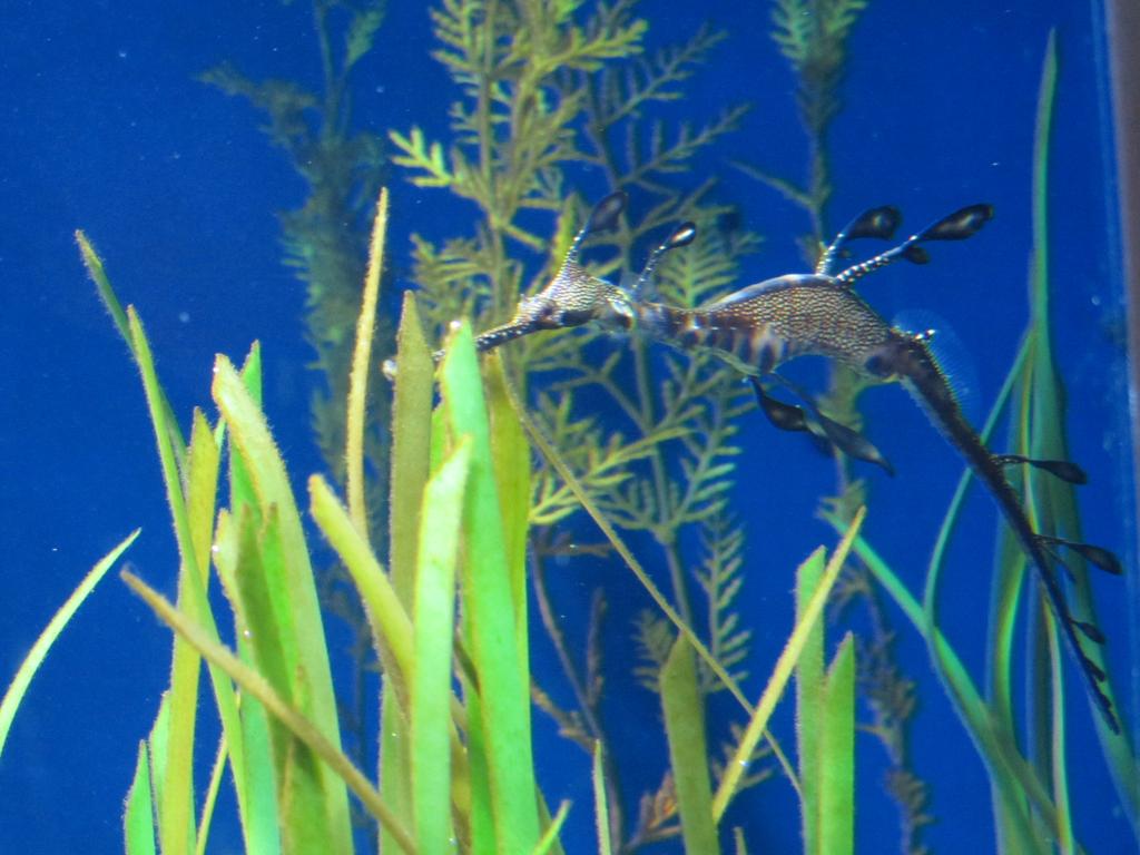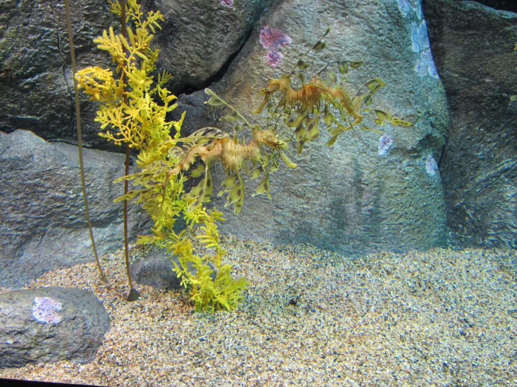 Fische haben wir auch im Monterey Bay Aquarium begucken können. Beeindruckend war das über zwei Stockwerke reichende Becken mit dem „kelp forest“, dem Algenwald, durch den die Fischschwärme jagen, in dem sich jedoch auch einzelne Fische unter die Algenblätter klemmen, um in Ruhe ein Nickerchen zu machen. Das Aquarium zeigt nicht nur einheimische Fischarten, sondern auch so seltene Tiere wie die „leafy seedragons“ und die „weedy seedragons“, die eigentlich in Australien heimisch sind. Beide gehören zur Familie der Seepferdchen, bei beiden trägt der Vater die Kinder aus, nachdem das Weibchen ihm die befruchteten Eier in eine Hautfalte am Schwanz gedrückt hat. Das nenn ich doch mal Emanzipation.