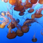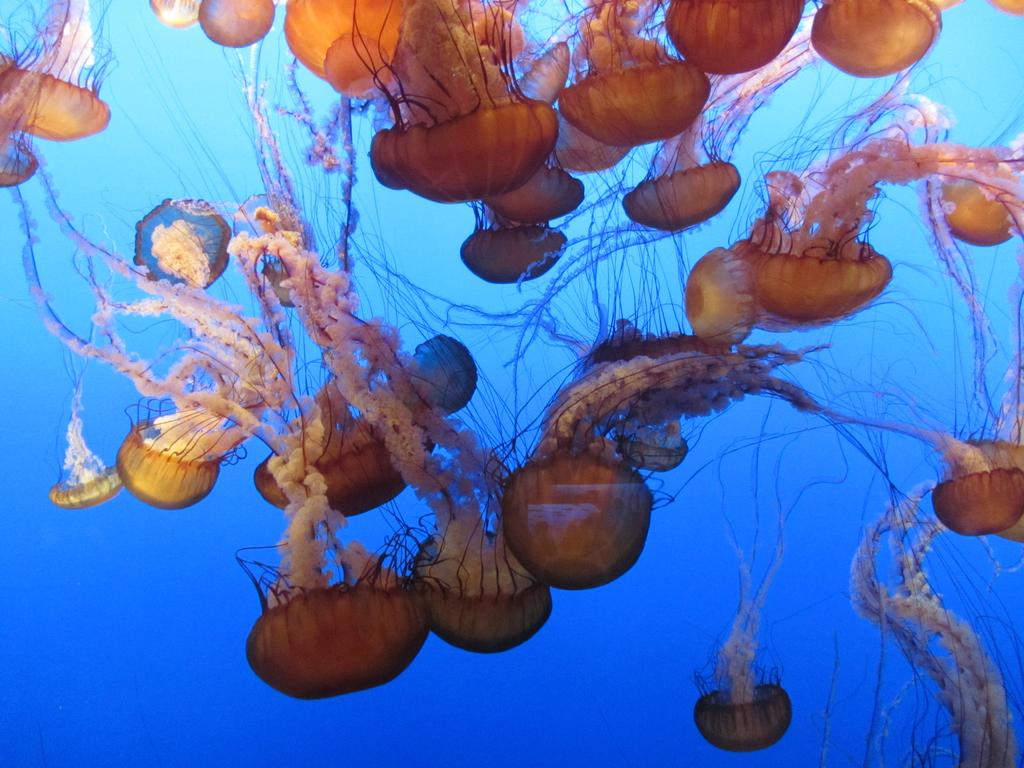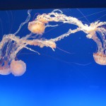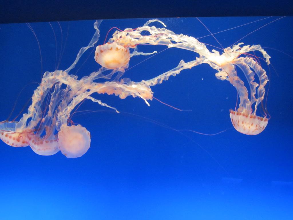 Farblich perfekt abgestimmt präsentierten sich die „jellies“. So werden die Quallen (jellyfish) hier liebevoll genannt. Vor einer sattblauen Wand schwebten die transparenten orange- und pinkfarbenen Gebilde rauf und runter, zogen ihre langen Tentakeln hinter sich, die sich miteinander verwoben und wieder auseinander drifteten. Ein stummes und zugleich farbenfrohes Wasserballett. Nein, sie haben sich erstaunlicherweise nicht verknotet.