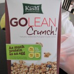 Hier ist so ein Ding, GoLean von der Firma Kashi. Wirbt mit dem Slogan “Stay Fuller Longer”. Das Zeug schmeckt wie Haferflocken mit Sägespähne, Nüssen und Sand. Ich kann mir schon vorstellen, dass das schwer verdaulich ist, wenn überhaupt. Leider hat e. verfügt, dass das aufgegessen wird. Und das ist an uns, der Hund mag es nämlich auch nicht.