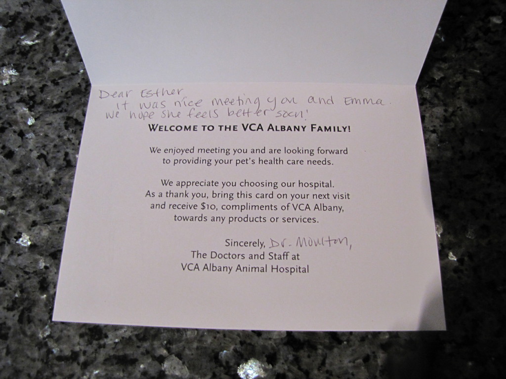 Kommen wir zu einem vollkommen anderen Thema. Es geht E. etwas besser, wenngleich noch lange nicht gut. Aber sie hat heute ihre erste Post bekommen mit vielen Wünschen zu einer baldigen Genesung. Der Absender ist die Tierärztin, bei der wir gestern Nachmittag (um Vier!) einen Termin hatten. Das finde ich sehr beachtlich und ich erwäge, mich zukünftig auch von ihr behandeln zu lassen.